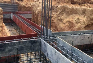 - Thi công phần móng và đà kiềng: Dựa theo tim trục đã định vị để thi công phần móng. Thông thường sẽ là móng đơn hoặc móng cọc, vật liệu là bê tông cốt thép. Các bu lông sẽ được chôn trong móng để sau này sẽ ghép với cột thép.